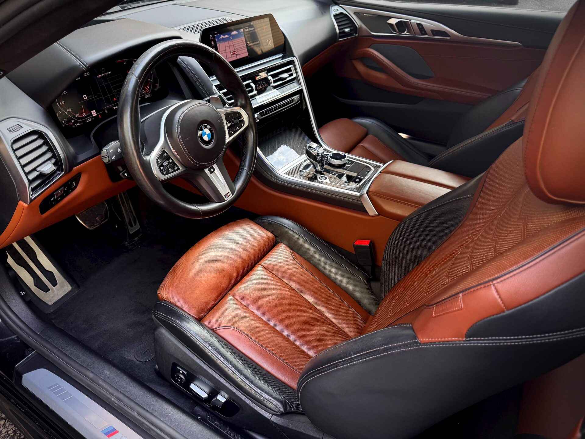This 2020 BMW M850i xDrive Coupe Is Finished In A Beautiful Black Exterior And Finished In A Tartufo (Brown) And Black Leather Interior. Fully Loaded w. True Keyless Entry w. Push To Start, Laserlight Headlights, M Aerodynamics Pkg, Active Steering, Adaptive M Suspension, Remote Engine Start, M Sport Brakes And Differential, Sport Seats, Heated Seats, Cooled Seats, Soft Close Doors, Black Alacantra Headliner, Rear View Cameras, 360 Camera, Navigation, Wireless Phone Charging, Driving Assistant Professional,Ambient Lighting, Adaptive cruise Control, Parking Sensors, Crafted Clarity Glass Shifter, Carbon Fibre Exterior Pkg Which Includes Carbon Fibre Front Bumper Inserts, Carbon Fibre Mirrors Caps, Carbon Fibre Spoiler, & Carbon Fibre Rear Diffuser, Carbon Fibre Interior Trim & Much More!